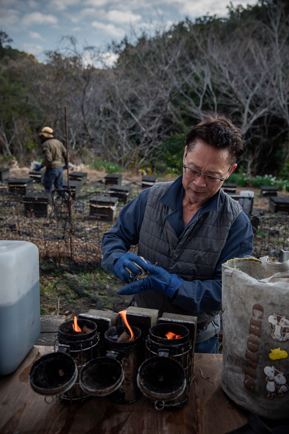 志摩半島のあづり蜂場に到着し正浩さんが3人分の燻煙器を準備する