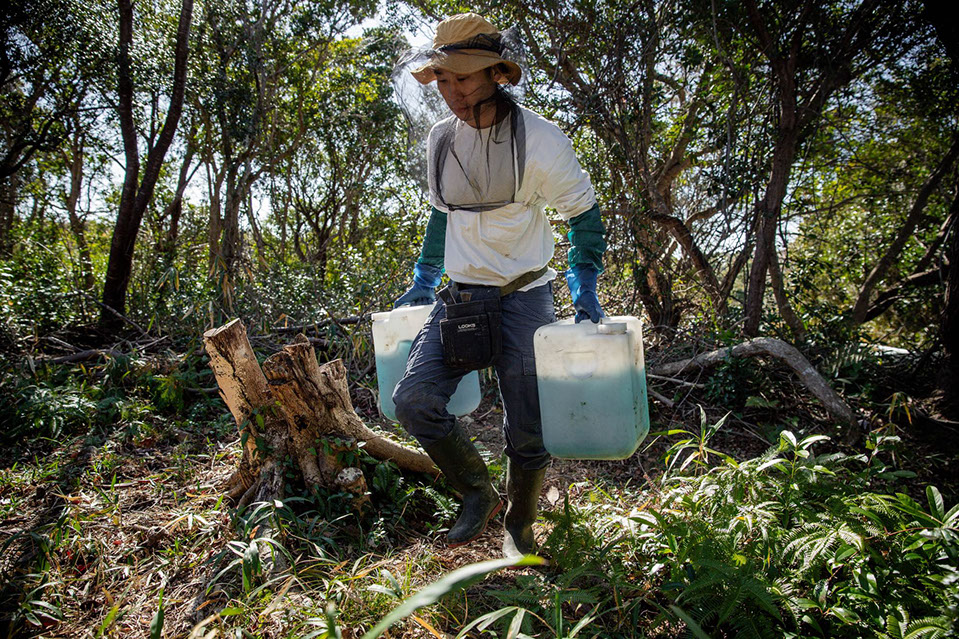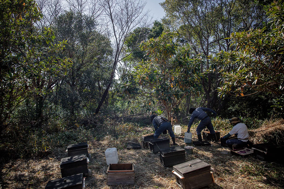 港蜂場で仕事を始める前、英幸さんが餌として与える砂糖水を運ぶ