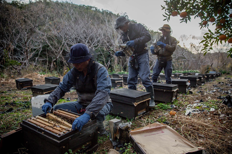 「静かに蓋を開けて、そっと巣枠の上の麻布を捲(めく)った瞬間に、その群の状態は分かりますからね。(燻煙器の)煙を掛けた時に上がってくるような蜂は要注意。沈んでいく蜂はきちっとしたええ蜂なんです」