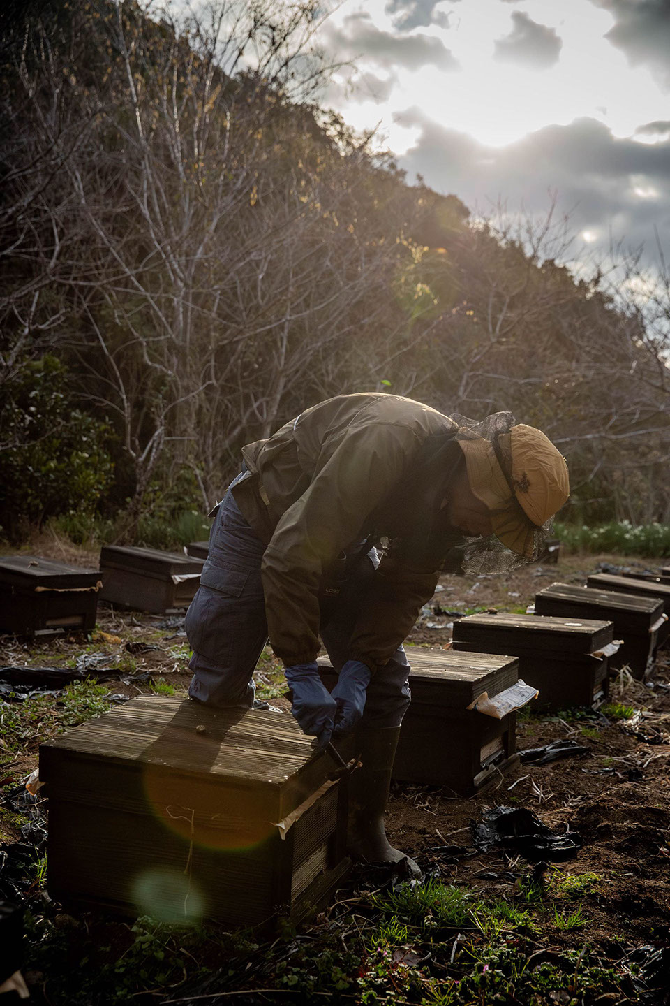 巣板を持ち上げて巣房の中を確認する作業はほとんどしない。ゆっくり麻布をめくり群全体の状態を確認すると、砂糖水を給餌箱に入れ代用花粉のパックを巣枠の上に置き、しずかに麻布を被せて蓋を閉める。とにかくスピードのある内検だ。この日の志摩半島の作業は、冬眠明けの最初の内検なので、代用花粉を与えて蜂たちを「春が近いぞ」と目覚めさせるための「建勢」作業なのだ。