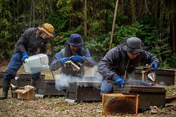 続いて正浩さんが、初夏の採蜜期の光景を思い出したように話し始める。「うちの採蜜はすごいです。とにかく速いですから、ロボットのように動いて、1日に150群を採蜜して一斗缶80本というのがあります。300群の蜂で一斗缶500本の蜜を採ってくるのやからね」。正浩さんが試行錯誤の末に完成させた効率的な採蜜システムへの自負が伝わる。