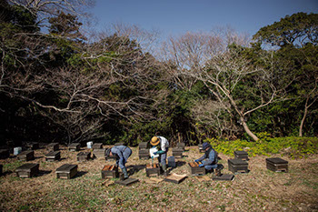 志摩半島で8番目の和具蜂場に到着して、昼食。正浩さんは朝コンビニで買った菓子パンを齧り、わずかの時間これからの段取りを3人で打ち合わせる。この時、正浩さんが「私はね、メモは取らないけど、1つ1つの巣箱を映像で頭に入れるんです」と、面白いことを私に告げる。写真を撮る仕事をしている私も映像で現場を把握しているため、正浩さんの言葉に共感できるが、正浩さんの言葉の真意は「巣箱の中の蜂の状態」まで映像で頭に入れるということなのだろう。その上、その映像は管理している600群の蜜蜂の現状を指すだけでなく、内検の度に変化する巣箱の中の状態をも指すのだから恐れ入る。