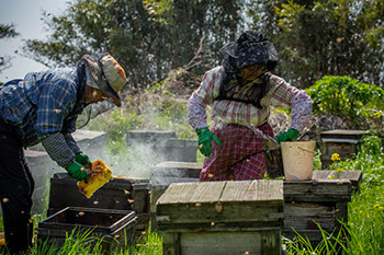 北海道ではカメムシ防除策として(摂取すると神経細胞に作用する毒を持つ)ネオニコチノイド系農薬をドローンなどで散布している。農協などを通じて散布する日時が事前に養蜂家に連絡され、蜜蜂の避難を呼び掛けられるが、直接暴露だけでなく水に溶けて植物にも取り込まれ、長期間分解されない残留性もあるため、避難が万全の対策とは言えないのが実情だ。主にEUの国々では、ミツバチの方向感覚などに障害が起きて巣に戻れなくなる蜂群崩壊症候群と呼ばれる現象が起きて、ネオニコチノイド系農薬との関連が疑われている。そのためEUでは2018年から幾種類かのネオニコチノイド系農薬の使用を規制しているが、我が国では規制はされていないため、純一さんが現状を憂いているのだ。