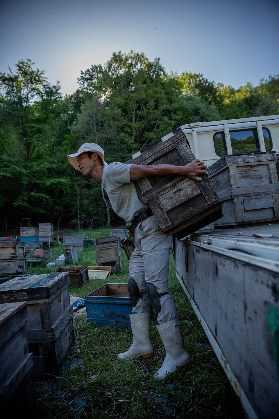 カーブの多い山道を走り続けた大台さんが運転する2tトラックは、京北工場の直前になって横道に入り、京北蜂場へ向かった。もう日は落ちて辺りは薄暗い。今更、蜂場での仕事はないだろうと思っていたが、大台さんは巣箱一つを抱えて蜂場入口の電柵を外し、10群ほど置いてあった巣箱から少し離して、持ち込んだ巣箱を置き、巣門を開けた。