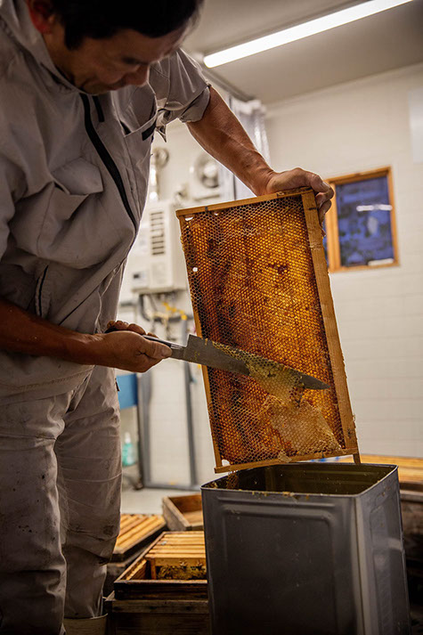 大台さんが蜜巣板を運び込むと、すぐに蜜蓋を切って遠心分離機にセットしていく。しかし、ほとんどの蜜巣板は切るほどの蜜蓋はできていない。糖度は大丈夫なのかと、心配になってくる。大台さんに質問すると、「サクラ蜜は蜜蓋していなくても糖度は高いので、蜜蓋ができるまで待たないで搾るんですよね」と、気にしている様子はない。私は半信半疑だ。遠心分離機を2度ほど回した後で、搾ったサクラ蜜を糖度計で測ってもらうと、何と80.8度もあった。大台さんは「ほらね」といった表情だ。続いて「アカシア蜜も水っぽいなという感じでも、糖度は高いんですよね。花蜜の糖度が高いんですかね」と、教えてくれた。それが、あの透明感のあるアカシア蜜の理由かも知れない。糖度計を仕舞っている大台さんの手が気になった。蜂場では素手で仕事をしているのだから多少汚れているのは仕方がないとしても、蜜を搾る工場でも大台さんの掌は黒くひび割れたように黒い縦の筋が指の内側全体に付いている。何度かブラシを使って洗っていたのは見ていたのだが……。「軽石で擦っても落ちないんです。スーパーの支払いでは絶対に人のいるレジには並ばないんです。セルフの方に行くんです。手を見られるのが嫌だから」と大台さん。そこまで気にしているとは思わず、気軽に「手を見せて」と言ってしまって後悔した。