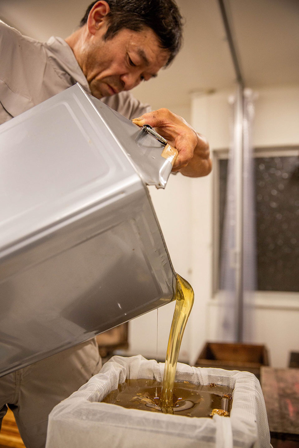 話が横道に逸れてしまったが、大台さんが運転する2tトラックが京北工場に到着した時すでに辺りは闇。休むこともなく大台さんが、上賀茂蜂場から抜き取ったサクラ蜜の巣板を、遠心分離機が設置された作業場へ次々と運び入れる。さすがにJFS-B規格に適合しているだけあって、衛生管理が行き届いた真っ白な空間だ。