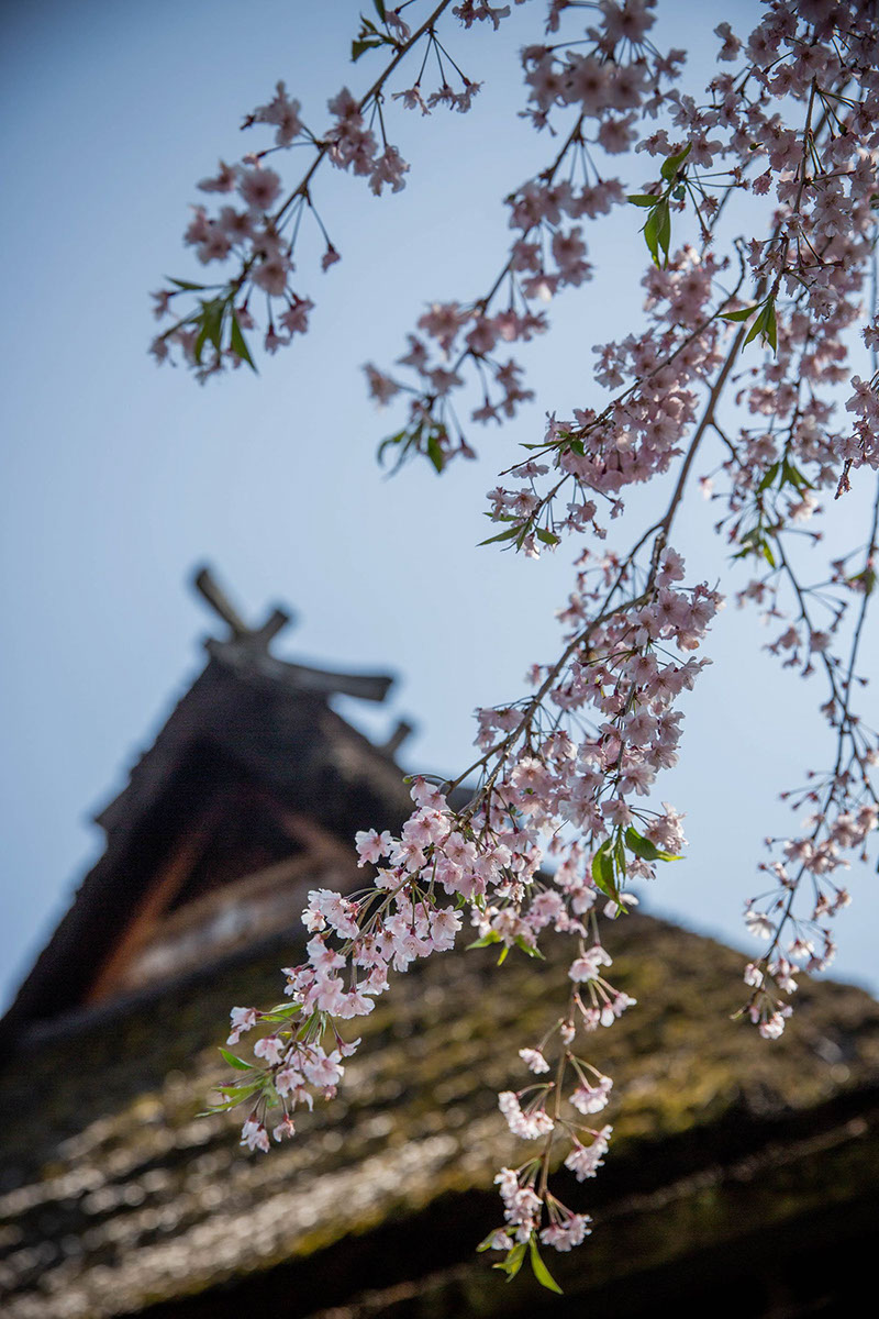 散り間際のしだれ桜の枝が茅葺き屋根に映える