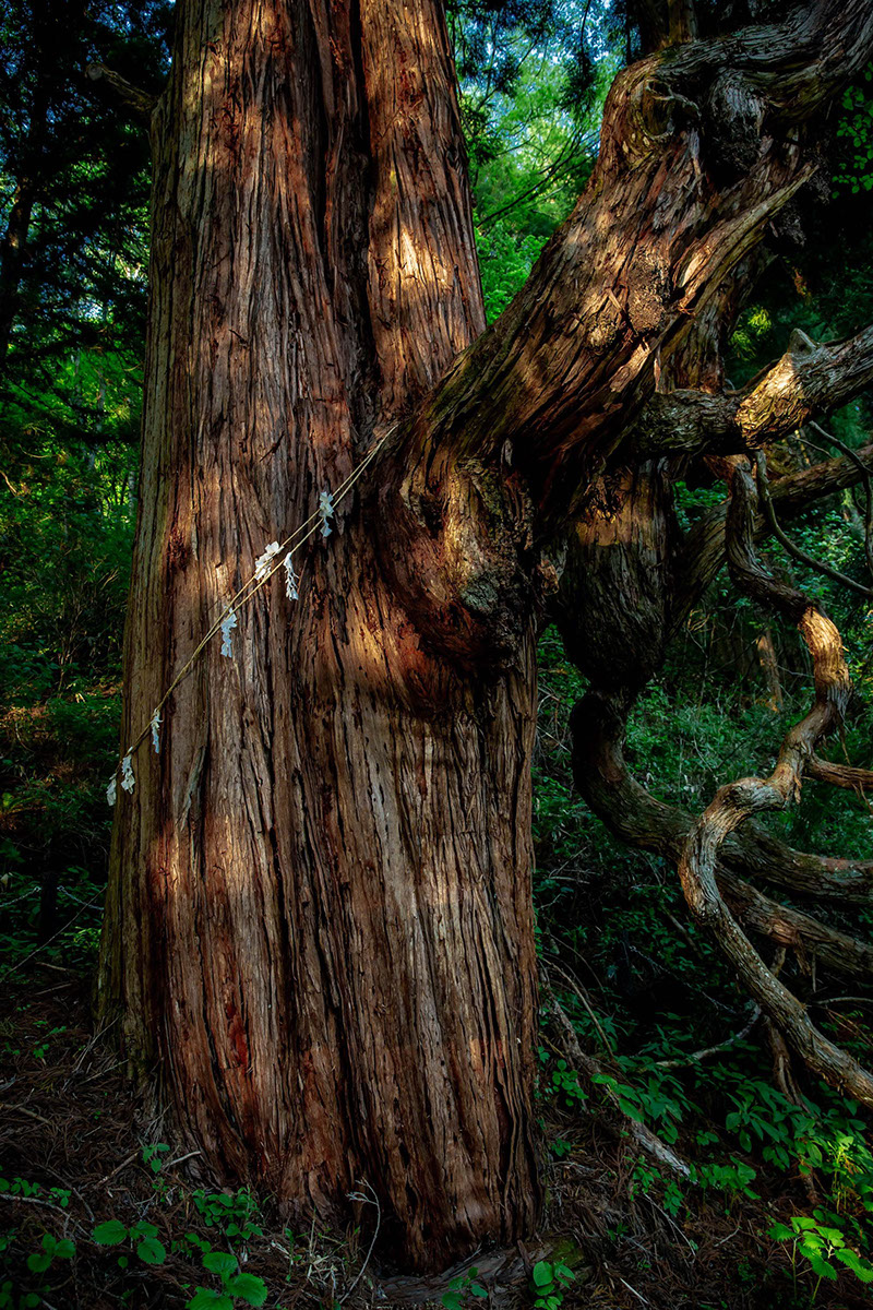 鳴尾の熊野神社大スギは熊野信仰の修験者が信仰の霊場とした所で、大スギから80mほど登った岩窟には梵字が刻まれているらしいが、私はこの日体調がすぐれず、すぐに息切れして食欲もなかったので、大スギの根元に座り込んで撮影しただけだった。後日、橋詰さんが言うには、軽い高山病に罹っていたのかも知れないとのことだ。最初に案内してもらった元鎌原村も鳴尾の熊野神社大スギの地点も、標高1200mほどの高地だ。到着していきなり動き始めたのは不用意だった。
