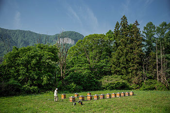 「遊休山林に巣箱を置かせてもらって、蜂場1か所に7群から11群。標高300mほどの高崎市内から同じ群馬県内の標高差を順に移動していくんです。高崎市内はアカシアの流蜜がもう終わりかけ、600m、700m、900mの蜂場でフジとトチが今、流蜜しています。これから1000m、1100mの所へ移動してフジとミズキを採蜜して、最も高い所だと1200mまで行きますね。群馬県は九州から北海道までの気候を高低差でカバーできるんです」