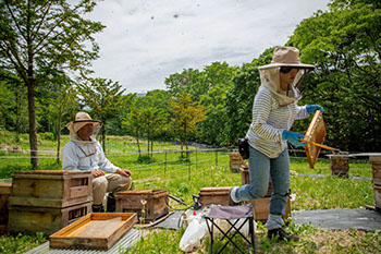 「(高崎市)榛名の梅林では、(蜂群を)持って行っただけで(梅の)生りが良くなったと褒めてくれる。自然界の循環を蜂が豊かにしてくれているんだよな。その結果、経済も回していければな」と、橋詰さん。それに呼応するように日月さんが「ここの場所(北軽井沢)で長く事業をやっていくには、どうしたら良いだろうと、常に考えていますね」。