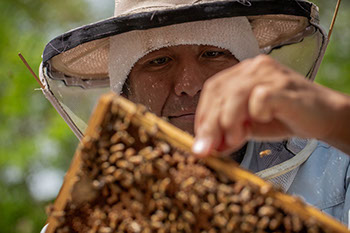 僕は(養蜂を)独学で始めたけど、群馬県内の養蜂家を訪ねて手伝わせてもらい勉強をしました。移虫はせずに王台、変成王台で群を伸ばすやり方です。会社の中で、養蜂をやりたいと言ってくれる社員がいるので(群数を増やすために)種蜂を配りたいと思っています。蜂を直接扱っているのは養蜂チームの3人だけど、社内の多くの人が可愛がってくれているので、現場の負担は少ないですね。ポリネーション用の巣箱は、会社で伐り出した材木のサワラやヒノキを林業部門で製材してもらって作っているんですよ。きたもっくの会社全体で蜂蜜に関してどう展開していくのかを描く必要があると思うけど、うちの会社は生態系みたいに部門間での関係が複雑だよね」