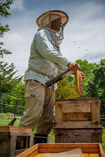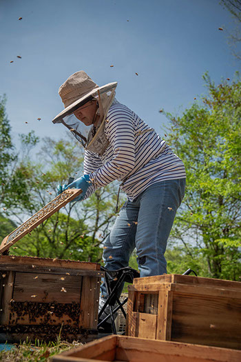 轟さんちの蜂場で内検をする将太さん。夏は燻煙器を使わない
