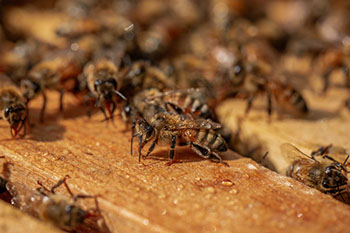 乳酸菌の入った水を噴霧された蜜蜂。「寒い時には煙、暑い時は水」と橋詰さん