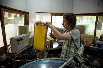 「何故か、ここに持ってくると、蜂が伸びる(数が増える)んですよね」と、橋詰さんが3段に積み上げた継ぎ箱に空巣を4枚入れている。