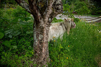 橋詰さんはここでも山羊の蓬と一緒である。狩宿蜂場の内検は30分ほどで終わった。7群の内検に3人で30分は、ゆっくりの作業だ。決して急がない養蜂チームの仕事を見て思い当たるのは、橋詰さんの人生観と重ね合わせた養蜂哲学だ。自然に任せる。蜂の立場で考える。人間からの関与は最小限とする。言葉で橋詰さんから聞いた訳ではないが、仕事ぶりを見ていて、そう伝わってくる。