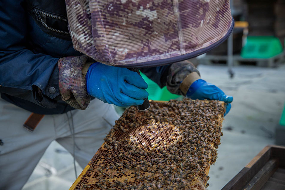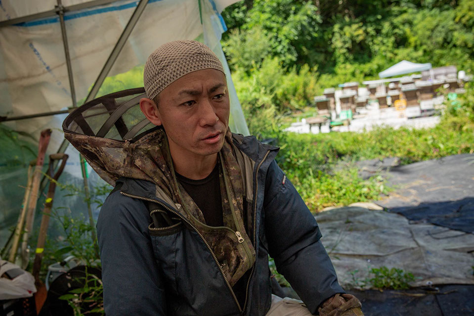 「自分で養蜂を始める前は、鉄道保線の仕事をしていましたから、勤務は夜なんです。眠らなければ昼間に仕事を作ることはできるんですよ。師匠の君塚さんの所に半年間、がっつり行きましたね。師匠の手伝いに行っていた春の暖かい日の朝でした。燻煙器に火を着けて蜂場の階段を下りて行ったら、巣箱の前の空間をものすごい数の蜂が飛び交っているんですよ。羽音がすごいじゃないですか。口の中に飛び込んで来るように蜂が飛び交っている。その様子を見た瞬間、感動しましたね。これで飯が食えたら幸せだなあ、と思いましたね。それから3か月ほど経って、君塚さんの蜂場の採蜜が終わり、気持ちにも時間にも余裕ができて、蜂蜜が幾らで売れるか経済面も教えて貰えて、半年間、君塚さんのところで集中して修業してから、この人の言うことを聞いたら俺は飯が食えると確信を持ったんです。それでカミさんに『仕事辞めても良いかな』って聞いたら『あんたならできると思うよ』と言ってくれて、それで決心しましたね。でも、その時、賛成してくれたのはカミさん一人だけでした。親も親戚もみんな反対」