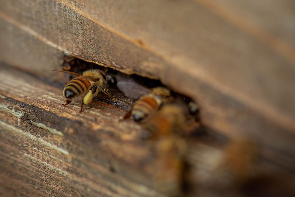 継ぎ箱に開けた小さな巣門に花粉団子を脚に付けて戻ってきた外勤蜂