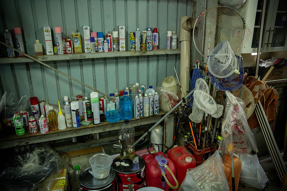 翌朝、蜂場へ行く準備で忙しくしている遠藤さんを自宅横の倉庫に訪ねると、「中を見ますか、写真は何を撮って良いですから」と、遠藤さんが私を倉庫の中に案内してくれた。失礼ながら倉庫の中はあまりにも雑然としていて、視点が定まらず写真を撮るまでには至らなかった。ただ壁際に雑然と並べられたスプレー缶や薬品のボトルなどがあり、それに捕虫網やタモ網の類いが無造作に立て掛けてあったのが印象的で、機械好きでありながらも自然志向の暮らし方が伝わってくる。