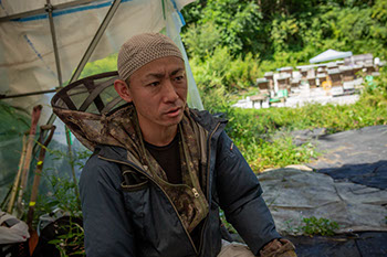 蜂場横のビニールハウスの倉庫で休憩する遠藤さん