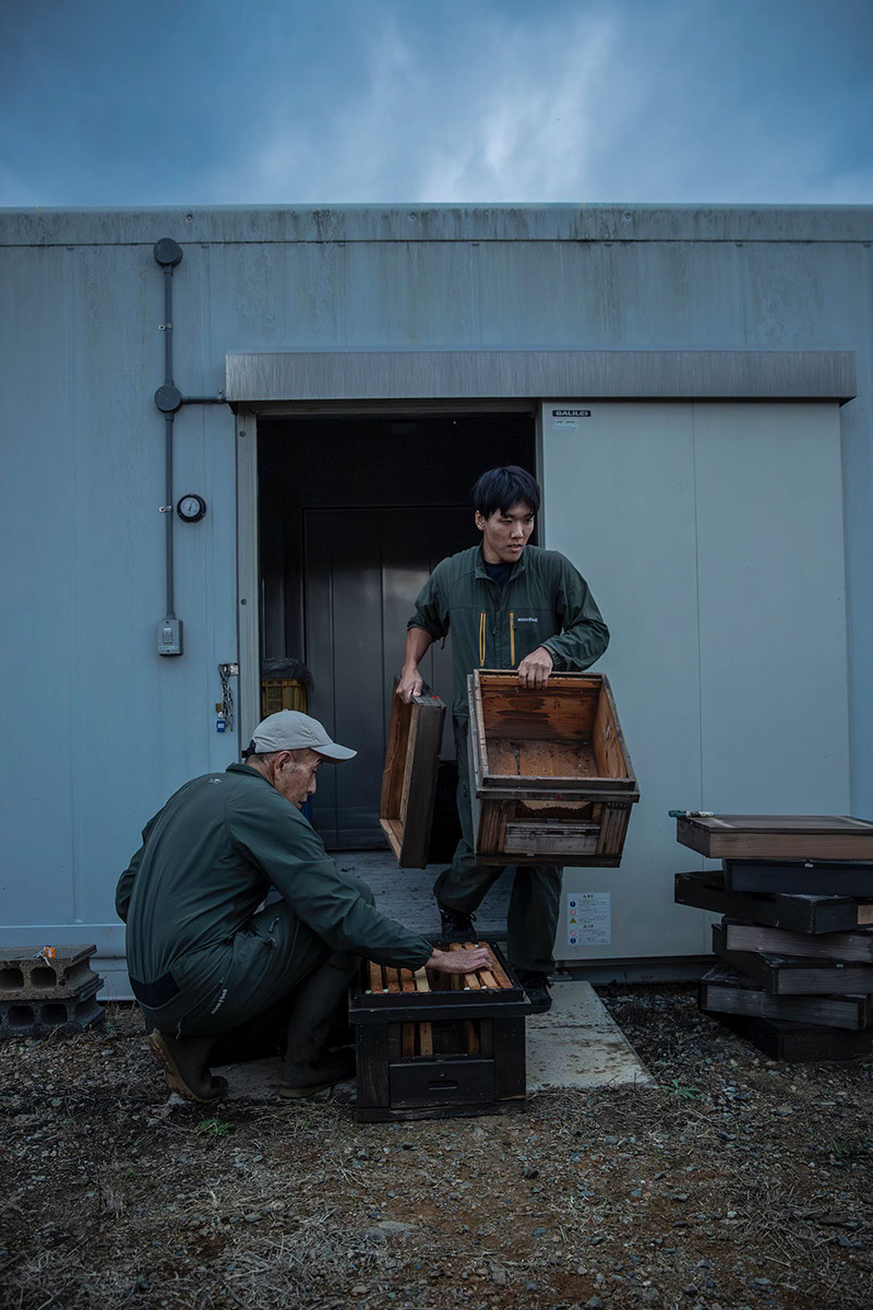 「蜂付きで1.5のところに入れるね」と、石川さんが細谷さんに告げている。蜂数が少なく、蜂児も少ない群の中に、有蓋蜂児(蛹のいる巣房に蓋をした巣板)の枠を蜂が集ったまま合同すると伝えている。これによって蜂数が増え、群の勢いが増すようにしているのだ。自らの作業を声に出して説明することで、蜂場全体の状況を共有しようとする意図が伝わってくる。