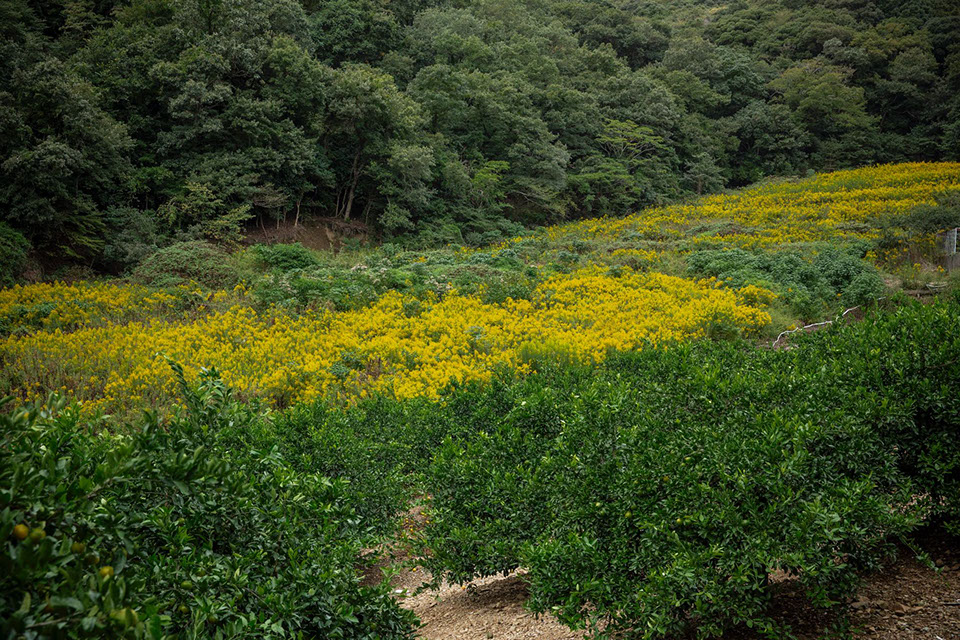 取材3日目は、平山蜂場の内検から始まった。すぐ近くのみかん畑では蜂場を借りている地主さんが、みかんの消毒をしているようでエンジン音が響いてくる。みかん畑の奥は一面のセイタカアワダチソウが満開だ。
