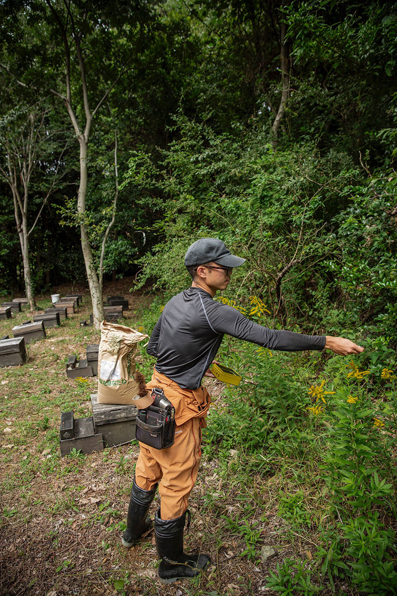 養蜂部の仕事振りを見ていて、開高健が何かの著書に書いていた「悠々として急げ」の言葉を思い出した。蜂場に緩やかな風が吹くようにゆったりとした3人の仕事ぶりだが、決して仕事が遅い訳ではない。蜂にとっても居心地の良い蜂場なのだろう。他所者の私が蜂場に入ると多くの場合、1匹や2匹は「刺すぞ」と言わんばかりに纏わり付く蜂がいるものだが、今回の取材中には1匹も現れなかった。