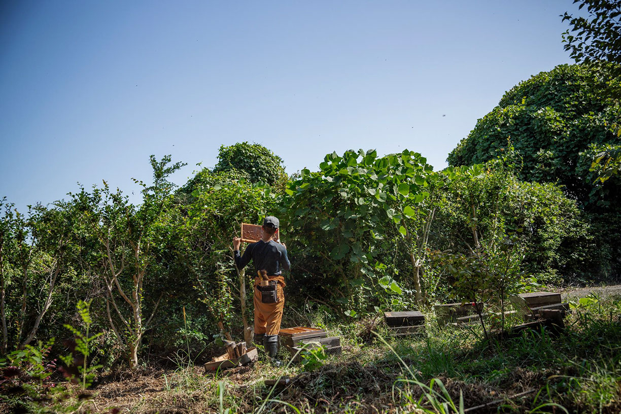 尾奈上蜂場で内検をする細谷一真さん