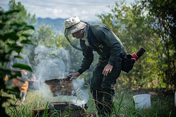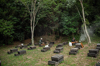 「僕が会社に入ってから開拓した蜂場も多いので、入社した5年前とはずいぶん変わりました。当初は200群ほどもない状態だったですが、来年の採蜜群は400群を目指しています。今の時期はみかんの収穫前で、人が山に入ってくる機会が多くなるので迷惑が掛からないように気を付けないとね。お借りしている土地ですから」