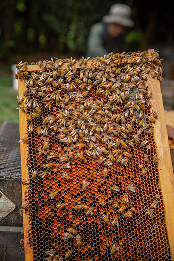 蜜を溜めてある巣房の蓋をハイブツールで傷を付けて蜂が餌として食べられるようにする