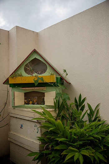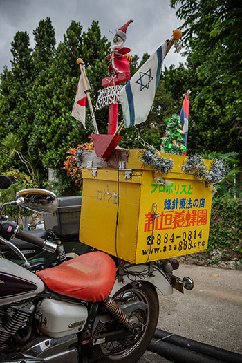 「蜂針治療は父から行けといわれて、医学の勉強みたいなもので難しくて、少しずつ勉強して、今では与那国や奄美大島まで口コミが広がって知られているようですけど……。匂いと噂は遠くから隣に来るようになったら本物だと言うからね。何でも口コミが一番良いですよ。蜂針治療は民間療法ですから口コミで広がっていくんですけど、戦前は蜂刺激療法という免許があったようなんですけど、戦後はアメリカ軍から駄目と言われ……。2000年にNPO法人日本アピセラピー研究会を立ち上げて、沖縄では2年前に蜂針治療する人たちで集まったんですけど、活動はまだ充分ではないですね。ずっと昔、私が小学校3年生の頃ですけどね。蜂針治療はうちの母がやっていましたよ。巣門のすぐ傍に座って、巣門を出入りする蜂を箸で摘まんで、知らないおばちゃんの背中に蜂針を刺していましたからね」