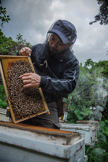求さんは幼稚園に通う頃から養蜂をやりたいと意志表示をしていたのだという。残念ながら求さんの経歴を詳しく伺う時間はなかったが、新垣養蜂園の対外的な窓口や屋上の蜂場の管理は長男の伝さんが担当し、種蜂や交配、採蜜の蜜蜂群を外の蜂場で管理するのは二男の求さんのようである。