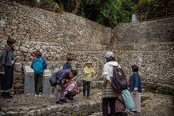 昔から近隣の人びとが生活用水として使っていた井戸「金城大樋川」(カナグスクウフヒージャー)を案内する