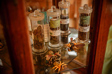 世界各地のプロポリスを集めた店内のガラスケース