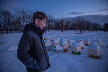日暮れ前、巣箱が雪に覆われていた工場団地蜂場を案内してくれた髙橋敦志さん