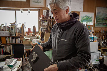 「ぼくが高校の時の恩師で、今もお付き合いをさせてもらっている美術の先生なんです。結婚式にも出席してもらったんですよ」と、彫刻家の古川敏郎(ふるかわ としろう)さん(61)を紹介する。この建物は古川さんのアトリエだったのだ。古川さんは驚いた様子もなく、すぐに状況を察したように髙橋さんが提供した蜜ロウを溶かした鍋を2つテーブルの上に並べた。