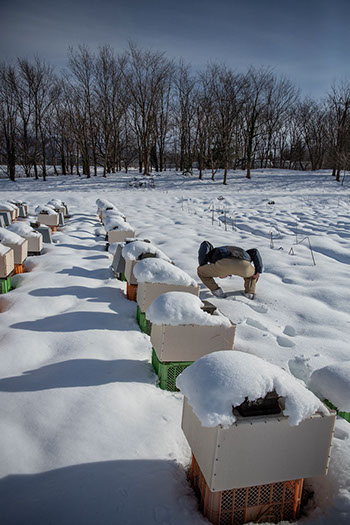 工場団地蜂場に到着したのは、午後1時半を過ぎていた。真っ白な雪原の中に、30個ほどの巣箱が丸餅のような雪を載せて並んでいる。