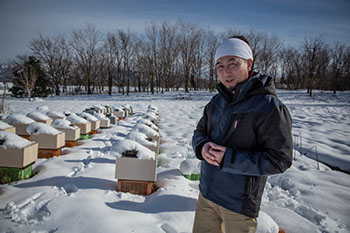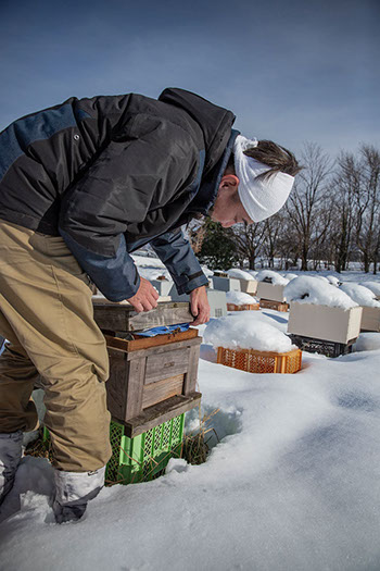 蜂の動きが気になるのか、髙橋敦志さんが巣門を覗き込む