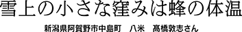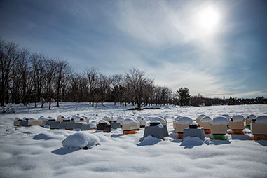 巣箱が雪原に置かれたままの工場団地蜂場。