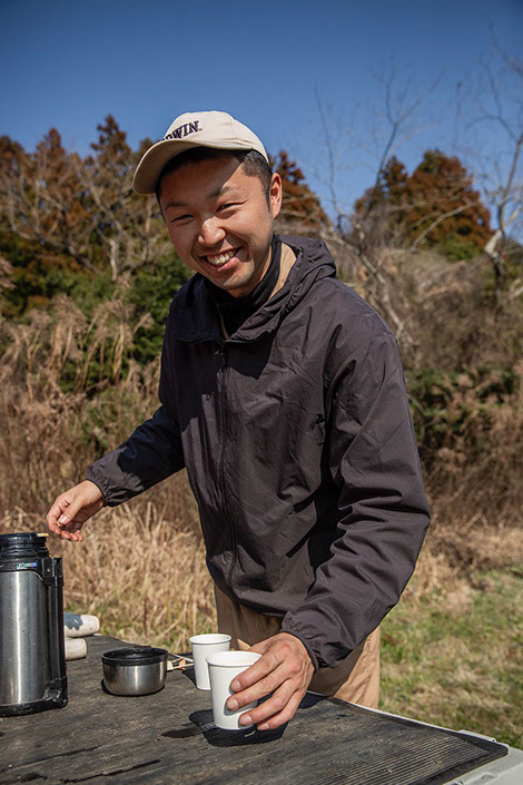 相谷蜂場でお茶の時間となり聖也さんがカフェオレを入れる