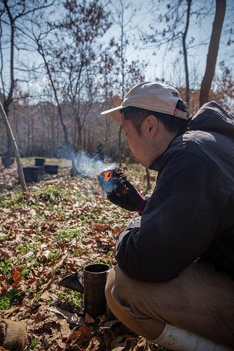 巣箱を「中山さん」蜂場に移動し、作業の前に聖也さんが燻煙器に火を着ける