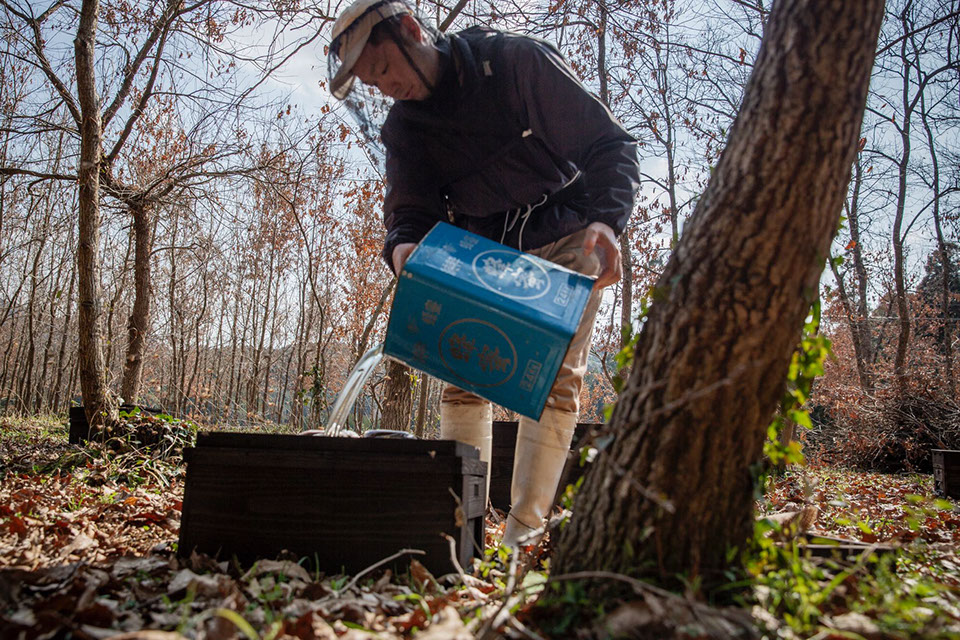 「自然界に花がない時季は、代用花粉団子がおかずで砂糖水がご飯なんです」と、その役割を教えてくれる。先にも書いたが、春先は、餌が少ないと蜂群が餓死し、餌が多いとこれから入ってくるであろう自然界の花蜜が入らない。一群一群の状態を確認した上での難しい判断を求められているのだ。聖也さんが軽トラの荷台に積んだオレンジ色の大きなタンクから上部を切り落とした一斗缶に餌を移し、巣箱の給餌箱に注意深く注いでいく。