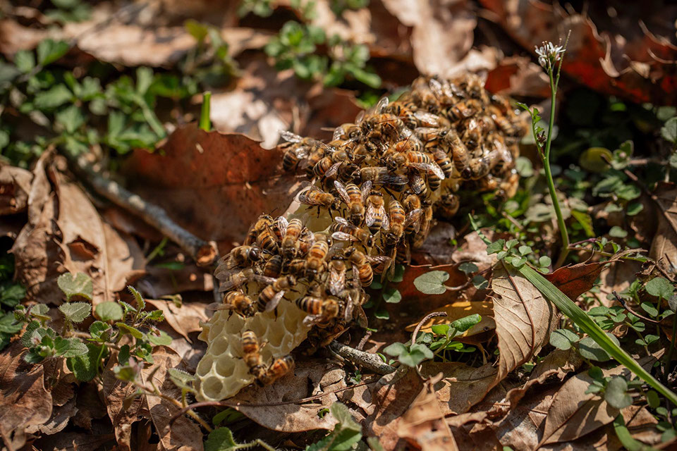「中山さん」蜂場で巣箱から取りだしたムダ巣に溜まった蜜に蜂が群がる