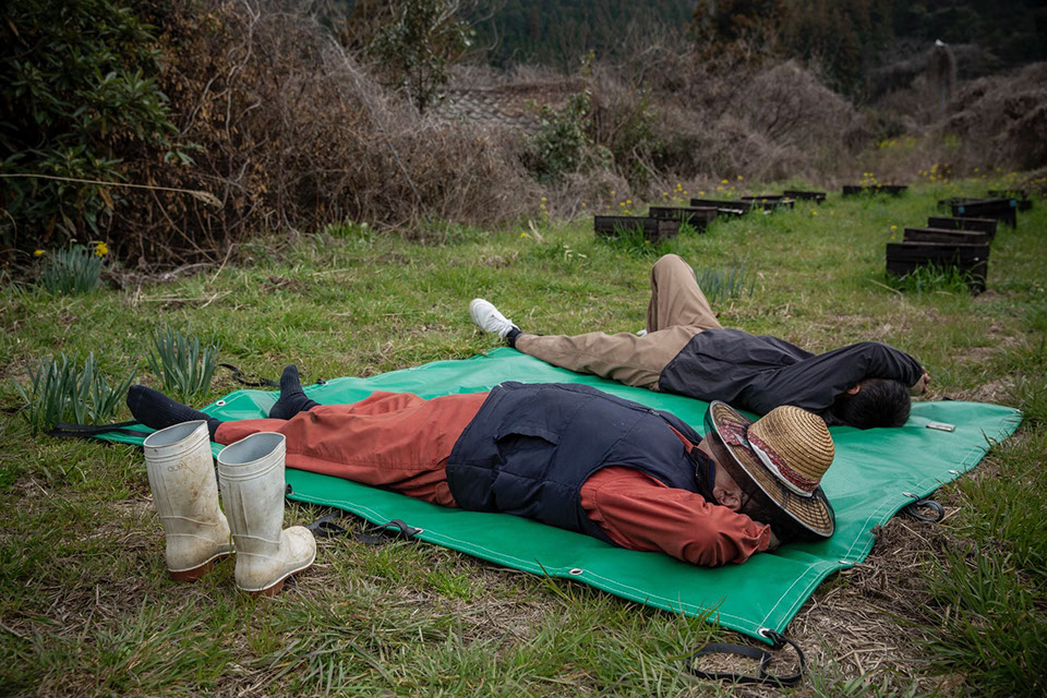 昼食を済ませて到着した板屋蜂場では、仕事を始める前に30分の昼寝をする