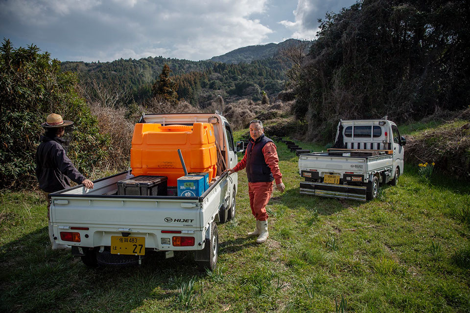 聖也さんも正広さんも、内検をする際に巣箱の横に立つと先ず、燻煙器の煙を巣門に向けてプップッと噴き掛ける。「今から作業するぞ」と挨拶をするようなものだと言う。ある養蜂家からは、作業をする前にトントンと蓋をノックすると聞いたことがある。このように蜂に対して敬意を払う養蜂家の蜂は概して温和しい。そう言えば、あまりにも当然のように思えて書き忘れていたが、聖也さんも正広さんも素手で内検をしている。「素手だと刺されると思うけん、やっぱ優しく蜂を扱うけんですね」と、聖也さんが素手で仕事をする理由を教えてくれた。