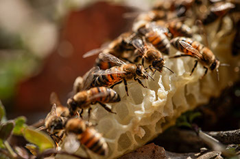 「中山さん」蜂場で巣箱から取りだしたムダ巣に溜まった蜜に蜂が群がる