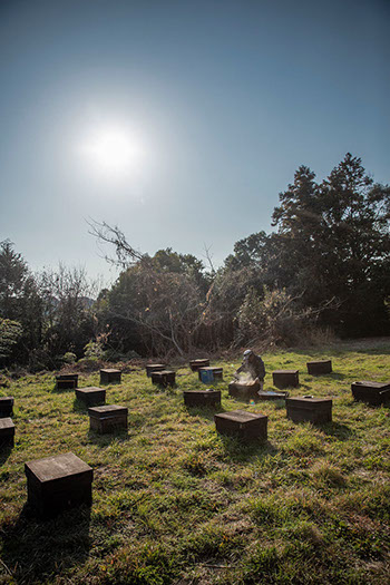 そう言うと、聖也さんは巣門を次々と閉めて歩き、巣箱を軽トラに積み込み始めた。この日は、正広さんが別件の用があって蜂場の仕事は聖也さん一人だ。36箱、軽トラの荷台一杯に巣箱を積み込み、伊万里市にある「中山さん」と呼ぶ蜂場へ向う。