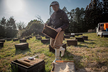 相谷蜂場で聖也さんが巣枠を一枚持ってきて挿す