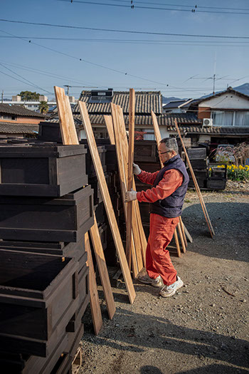 「中山さん」蜂場で聖也さんが給餌箱を掃除して餌を与える準備をする